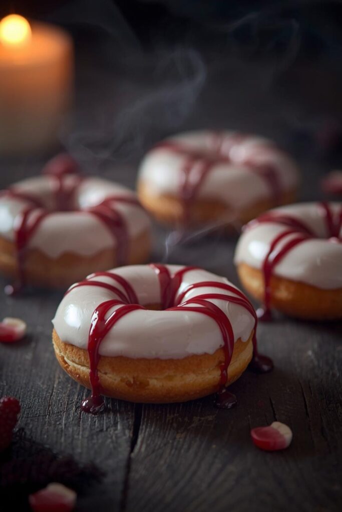 Mix chocolate frosting with a few drops of red gel. Creates dark blood color. Spread on half of each donut. Press two white chocolate chips into frosting as fangs. Use clean toothpick to make two small holes above fangs. Fill holes with raspberry jam. It’ll ooze out like fresh bite marks. Dust with powdered sugar for extra effect. Takes five minutes per donut. Maximum impact, minimum effort.