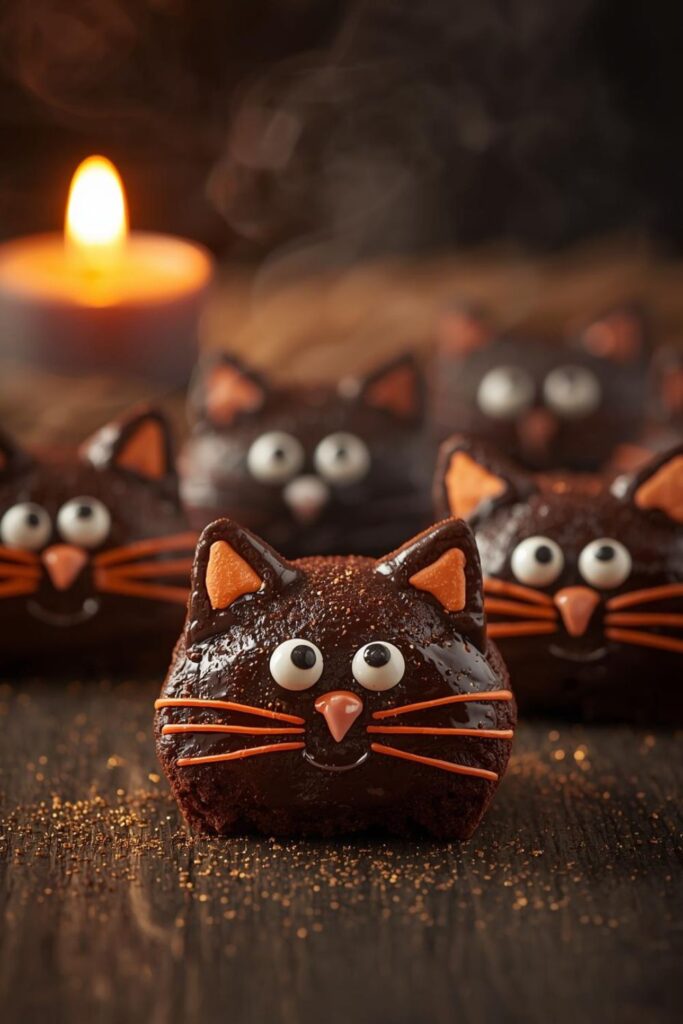 Bake brownies and cool completely. Cut into squares. Mix frosting with black gel until deep black. Frost each brownie smoothly. Press two candy eyes near top. Cut small triangles from orange candies for noses. Place below eyes. Cut licorice into thin strips. Press three on each side for whiskers. Use small dabs of frosting to attach if needed. Cut tiny triangles from leftover brownie scraps for ears. Attach with frosting at top corners. These look professionally decorated. But they’re actually super simple.
