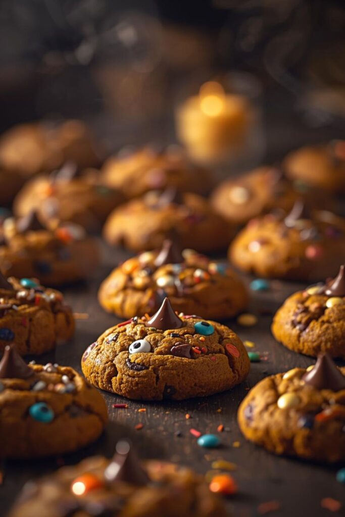 Cream butter and sugars for 3-4 minutes. Add pumpkin, egg, vanilla. Mix dry ingredients separately. Fold dry into wet. Stir in chocolate chips. Scoop golf ball-sized dough onto sheets. Press candy eyeballs all over. Bake at 350°F for 12-14 minutes. Pumpkin keeps these soft for days.
