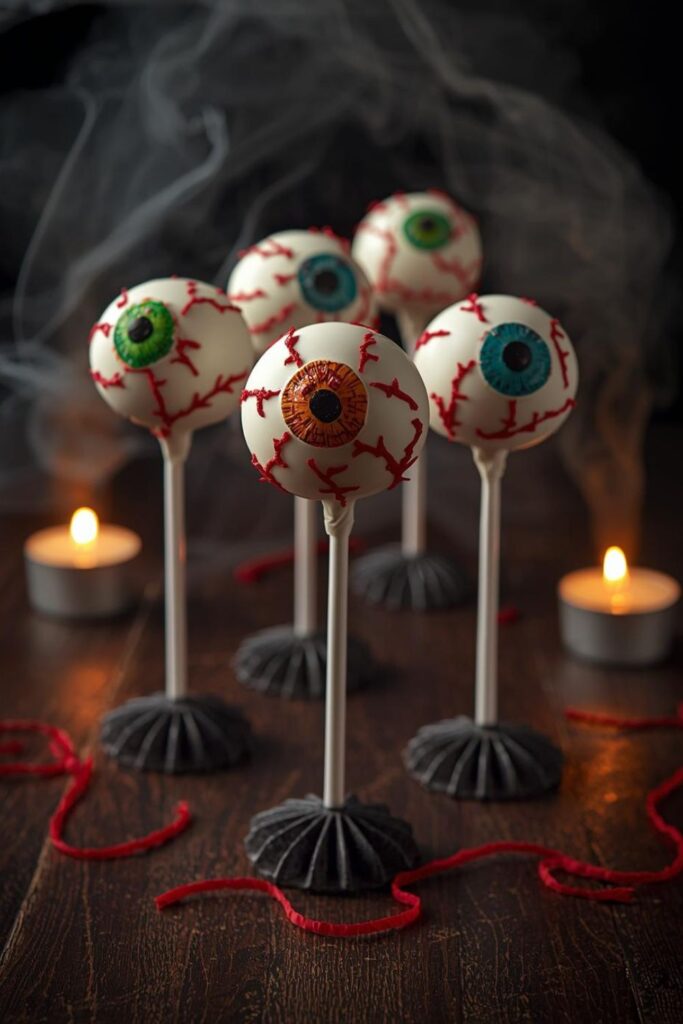 Crumble cooled cake completely. Mix with frosting until it holds together. Roll into golf ball spheres. Freeze 15 minutes. Melt candy melts. Insert stick into each ball. Dip in white coating. Tap off excess. Draw red veins with toothpick and food coloring while wet. Let set. Draw pupils with black marker. Make them look in different directions.