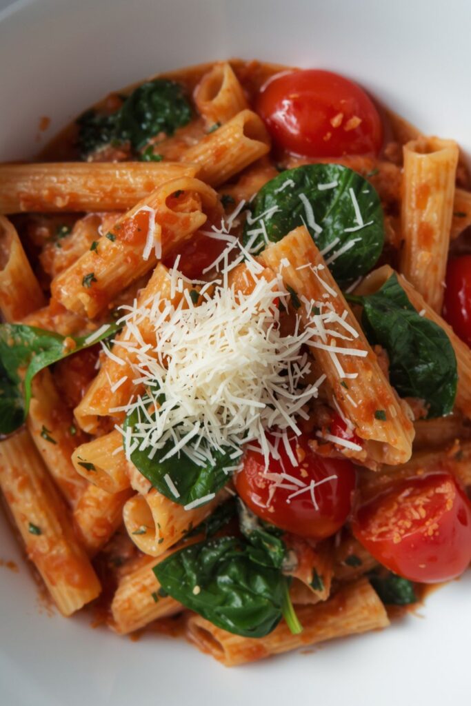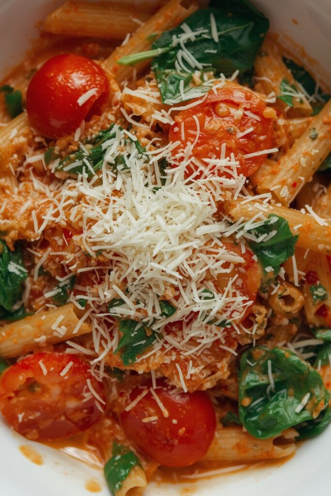 Remove from heat and add half the Parmesan, tossing until it melts completely. This creates another layer of creaminess and helps bind everything together in your finished Copycat Noodles And Company Penne Rosa.