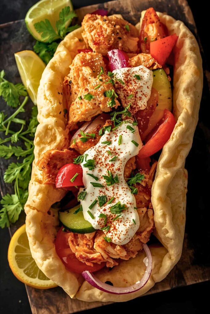 Spread generous tzatziki down the center. Don’t be shy with it. This makes every bite creamy and delicious. Layer on your sliced chicken generously. Add tomatoes, onions, and fresh lettuce. Crumble feta over everything liberally. Squeeze fresh lemon juice on top.